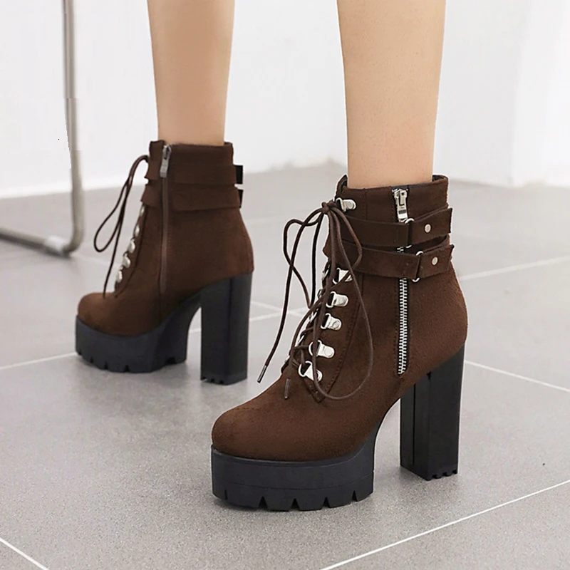 Bæltespænde Ankelstøvler Høj Platform Hæle Sko Cross Bundet Kontor Dame Efterårsstøvler Street Style