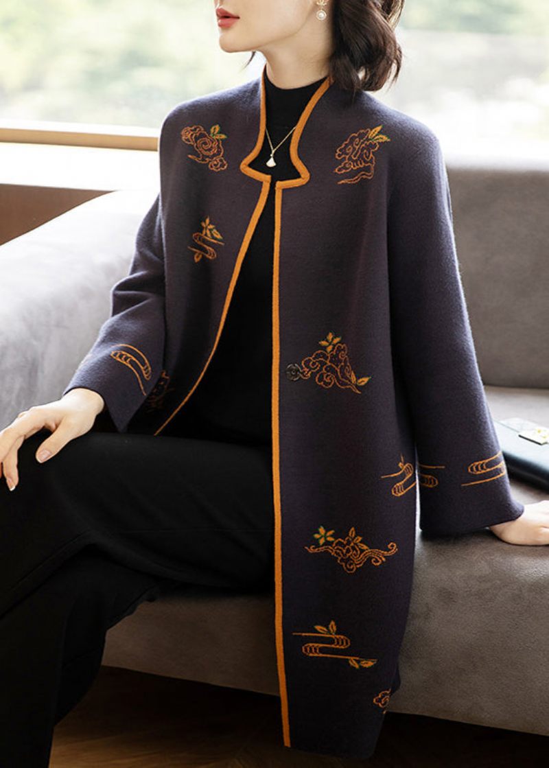 Bohemian Mørk Lilla Stand Krave Broderet Patchwork Uld Frakker Efterår