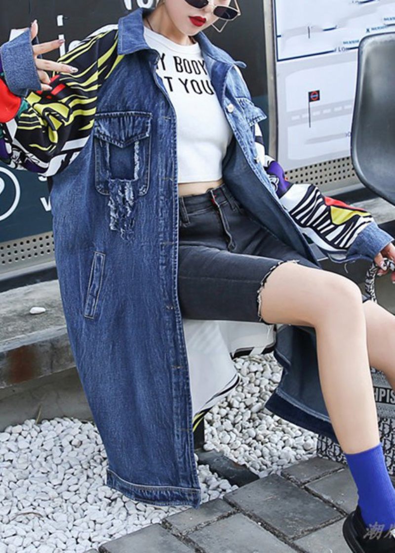 Boutique Blå Peter Pan Krave Print Knap Lang Denim Frakke Efterår