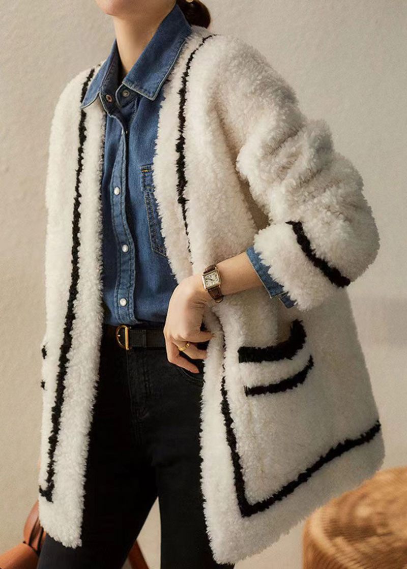 Franske Hvide V-halslommer Patchwork Uldfrakker Vinter