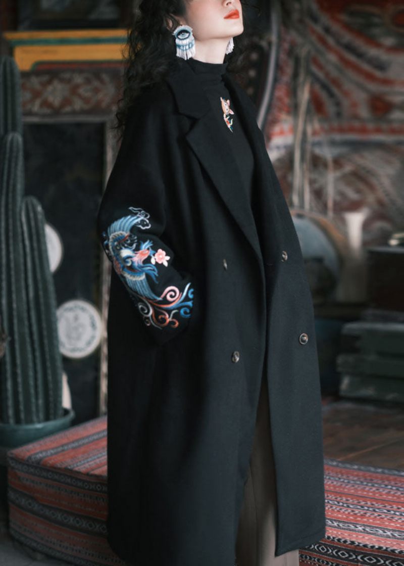 Franske Sorte Broderede Lommer Ulden Trench Vinter