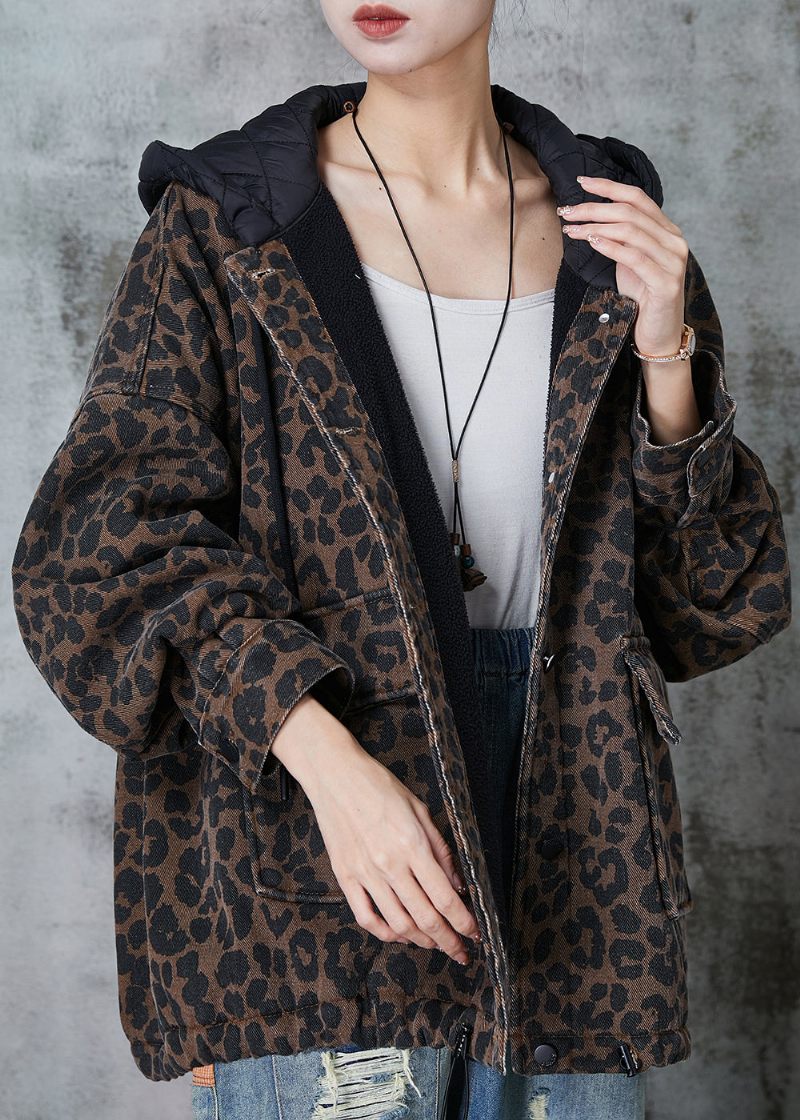 Kvinder Kaffe Hætte Leopard Print Varm Fleece Coat Spring