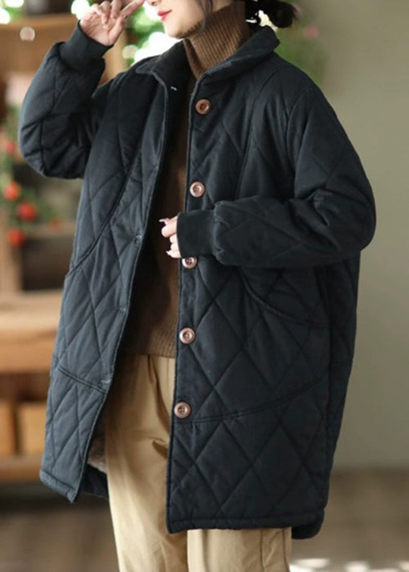 Løse Sorte Knaplommer Fleeceuldforet Parka Langærmet
