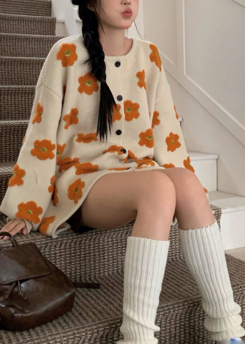 Plus Size Abrikos Blomster Bomuld Strik Sweater Frakker Langærmet