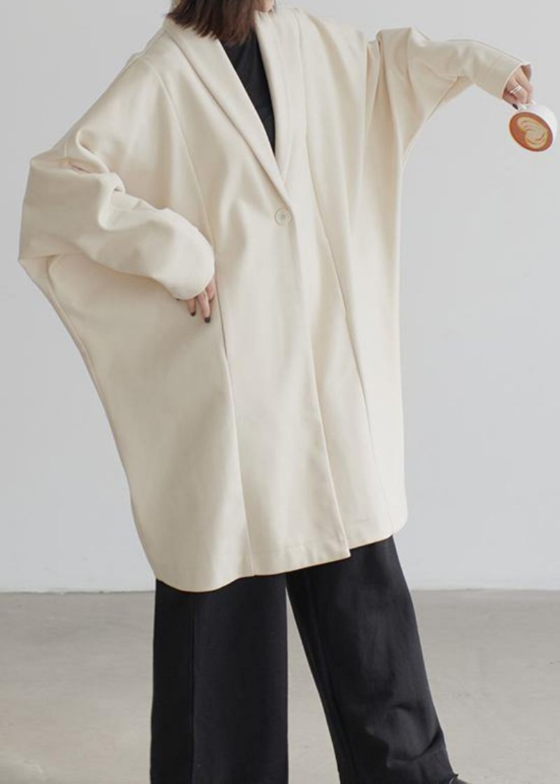 Vintage Beige Uld Overfrakke Løstsiddende Frakker Batwing Ærmer Lommer
